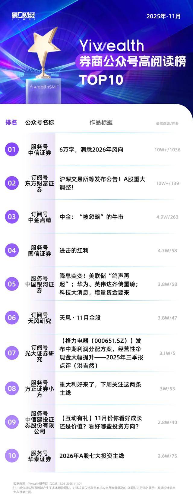 公众号榜单上榜作品以市场重要资讯、投资前瞻为主。例如,中信证券服务号的6万字,洞悉2026年风向以10万+阅读量夺得榜首,这篇年度策略报告展现了深度研报的持续影响力和用户对前瞻性内容的强烈需求。