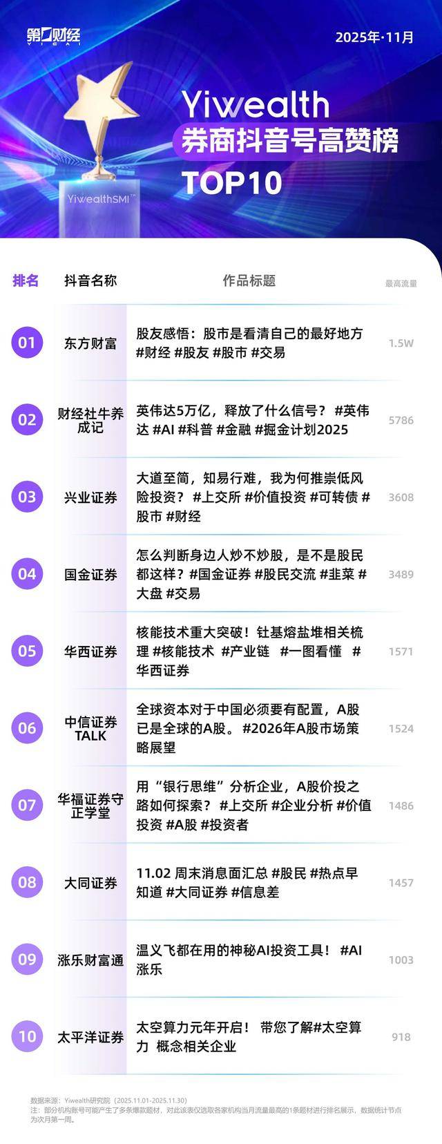 11月抖音高赞榜呈现出情感化、热点化、实用化特征。榜首东方财富延续其爆款制造机的风格,以股友感悟:股市是看清自己的最好地方为主题,用心理学等视角解读投资行为,让用户产生情感上的共鸣,凭借1.5万点赞收获高赞榜TOP1席位。国金证券则从怎么判断身边人炒不炒股的趣味角度切入,以漫画调侃的方式演绎股民群体存在的“生活节俭、社交简单、专注投资”特征,引发股民共鸣。财经社牛养成记解读英伟达市值突破5万亿、华西证券关于核能技术突破的前瞻性内容、中信证券TALK分析全球资本对于中国必须要有配置也都得到了众多用户点赞,显示出券商深度投教和全球视野的内容正在收获更多用户青睐。华福证券守正学堂关于银行思维分析企业的方法论,以及华泰证券涨乐财富通关于AI投资工具的分享,显示出实用投资方法论方面的内容也受到了较多的用户关注。