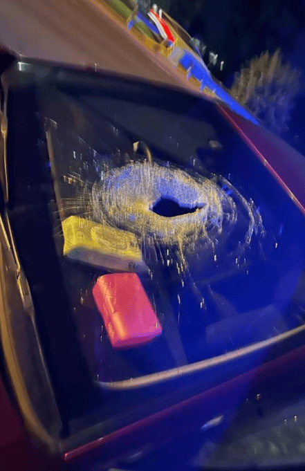警方表示,五辆汽车受损,其中至少两辆车被砖头直接砸穿挡风玻璃,损毁严重,当场无法继续行驶,只能被拖走。现场照片显示一块砖头穿透玻璃后,正落在副驾驶座上。