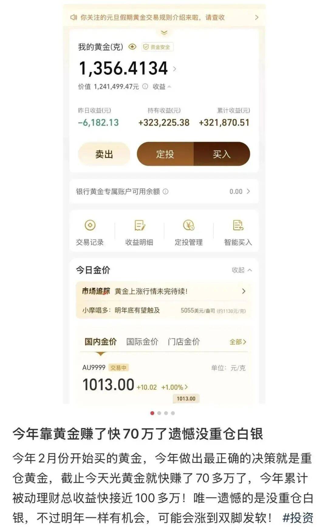 “今年靠黄金赚了快70万,遗憾没重仓白银。”有网友“小太阳”晒出自己的投资收益。记者注意到,仅在一个平台,他就购买了超过120万的黄金,收益超过30万。