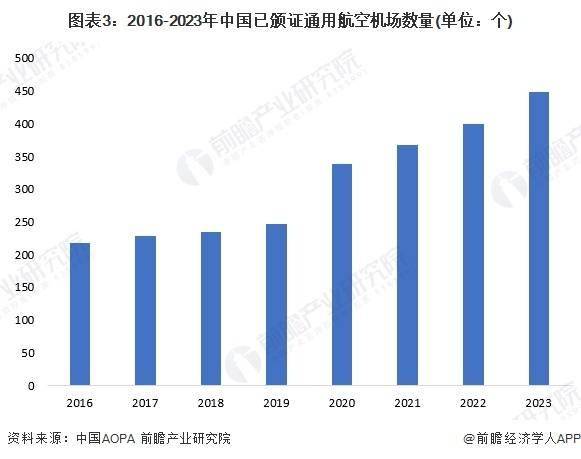 从数据上看,我国航空市场呈现出蓬勃发展的态势。2016-2023年,国内颁证通用航空机场数量持续增长.根据中国AOPA的数据,截至2023年底已达449个。