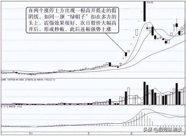 ,收出一根假阴线,但实际上股价依旧是保持上涨姿态的,从K线图上看,像是穿戴了一顶“绿帽子”。第三天,主力一改前日颓势,再次以涨停或大阳线的方式向上拉升,收复了这根“绿帽子”K线,开启强势上涨主升浪,所以我们将主力这种做盘方式称之为摘绿帽子,其技术特点为:(1)股价在经历过一段长时间的低位缩量