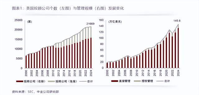 美国投顾市场规模持续扩容,呈现“头部集中、生态多元”的格局。据中金公司,截至2024年美国投顾公司数量达15906家,从客户资产规模来看,美国投顾直接管理的规模整体从2000年的不到20万亿美元以相对稳定的趋势上升至2024年的145.8万亿美元,其中第三方投顾是重要组成部分。