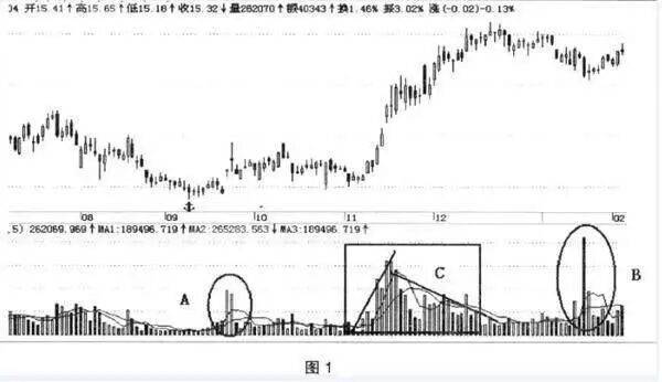如图1所示,图中A、B两点的量能就属于量能异常放大的巨量。在这两个位置,股票的成交量与之前的量能相比突然放大,成为一种独立的异常巨量。这种股票要么有突发消息影响,要么突然有盘中或外面资金对该股进行买卖操作,不确定性因素增加,所以是我们所要必须回避的股票之一。