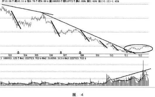 当股价下跌到了后期,个股的成交量开始逐渐活跃。这时候,股价开始走平,日K线也开始出现阳线多于阴线的形态。日K线的低点开始逐步抬高,成交量稳步放大,这时候该股不但打破了原有的下跌趋势,而且也摆脱了快速下跌的走势。