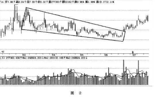 当股价冲破下降通道的上沿,同时成交量开始放大给予上涨动力的时候,我们这时才可以对该股进行关注。股价的波幅变大,在盘中我们才可以寻找高低点进行买进或卖出,波段的高低点掌控,可以让我们很容易运用以前介绍的当日获利的方法寻找最佳买卖点,这样交易的风险就会大大降低。