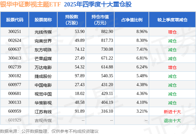 根据2025基金年报公募基金重仓股数据,重仓该股的公募基金共3家,其中持有数量最多的公募基金为银华基金的银华中证影视主题ETF。银华中证影视主题ETF目前规模为0.99亿元,最新净值1.1378(2月12日),较上一交易日下跌3.44%,近一年上涨14.99%。该公募基金现任基金经理为张亦驰。张亦驰在任的基金产品包括:银华华证ESG领先指数,管理时间为2021年11月23日至今,期间收益率为14.39%;银华中证农业主题ETF,管理时间为2022年6月20日至今,期间收益率为-12.02%;银华中证内地地产主题ETF,管理时间为2022年11月21日至今,期间收益率为-32.55%。