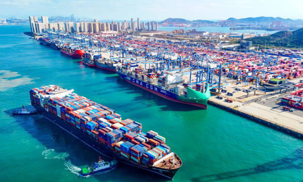 一艘货轮满载货物驶出青岛自贸片区(2025年11月5日摄,无人机照片)。新华社