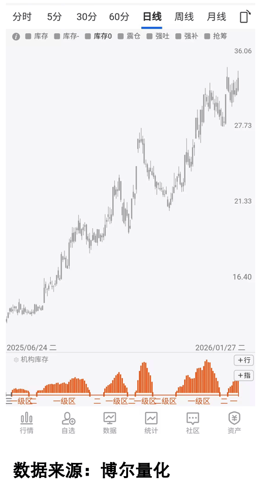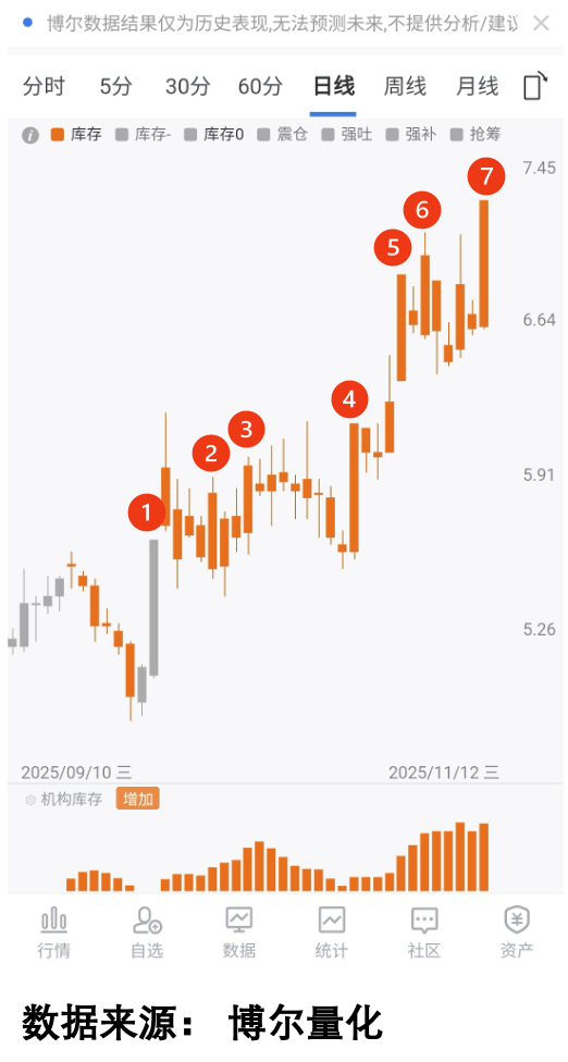 比如这只品种,从9月份到12月份,整整三个月时间里,价格看起来涨涨跌跌,但量化数据显示,机构的参与行为一直没断过:有时候是积极参与(橙色柱体),有时候是静默等待(橙色线段),正是这种持续的参与,才支撑了它的长期交易特征。如果只看表面的价格波动,可能早就被反复的调整磨得失去耐心,但看量化数据,就能明白背后的核心逻辑。