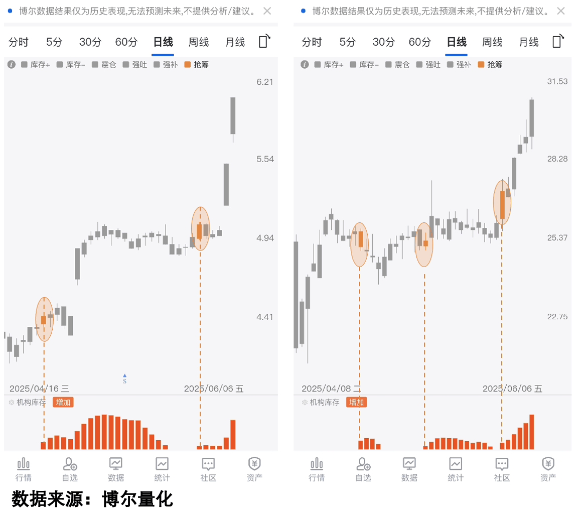 除了资金争抢的标的,还有一类是通过反复调整筛选出来的优质标的,这背后的核心是资金的洗盘行为。从量化行为数据看,机构的震仓洗盘可以通过特定数据组合识别,当「机构库存」数据叠加「空头回补」数据同时出现时,往往是调整即将进入尾声的逻辑拐点,说明机构在通过调整收集更多筹码,而非放弃标的。